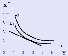 3) На рис. показаны бюджетная прямая и карта кривых безразличия. Как должна измениться цена блага Х, чтобы потребитель при неизменном бюджете мог увеличить свое благосостояние, повысив его до уровня U2? Какой минимальный потребительский набор сможет при этом приобрести покупатель?
