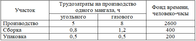 После предпринятой рекламной компании фирма «Отдых» испытывает рост спроса на два типа мангалов для приготовления шашлыков на открытом воздухе – газовые и угольные. Фирма заключила контракт на ежемесячную поставку в магазины 300 угольных и 300 газовых мангалов. Производство мангалов ограничивается мощностью следующих трех участков: производства деталей, сборки и упаковки. В таблице показано, сколько человеко-часов затрачивается на каждом участке на каждую единицу продукции, а также приведен допустимый ежемесячный объем трудозатрат: