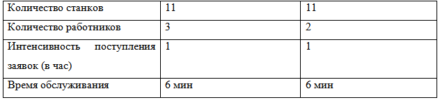 Допустим имеется возможность выбора способа реализации производственного процесса, используя различные технологии и различное оборудование: 1-й способ, рассмотренный в варианте, 2-й способ, для которого необходимо также рассчитать все приведенные показатели и сравнить с 1-м, определяется следующим образом: количество работников необходимо увеличить на 1 для всех вариантов. Интенсивность поступления заявок во всех случаях равна 1 (один из станков выходит из строя в среднем 1 раз в час), время обслуживания станка 6 мин.