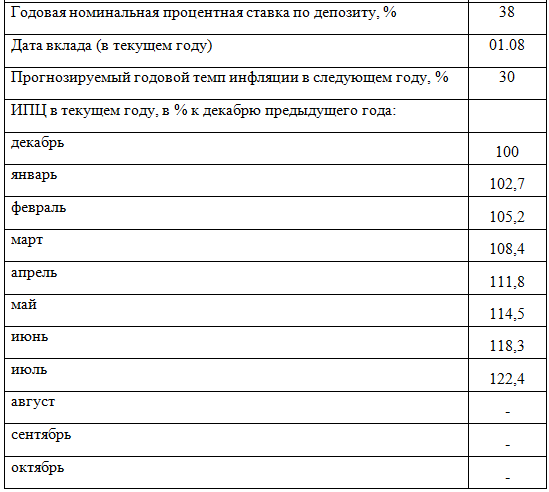 Рассчитать реальную процентную ставку по депозиту на основе имеющейся информации (табл. 6). Сделать вывод о целесообразности размещения средств на депозит.