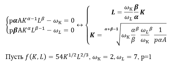 В модели фирмы с производственной функцией Кобба-Дугласа f(K,L)=AK^α L^β затраты капитала обозначены через К, затраты труда через L. Цены единицы ресурсов равны ω_К, K-ω_L соответственно,