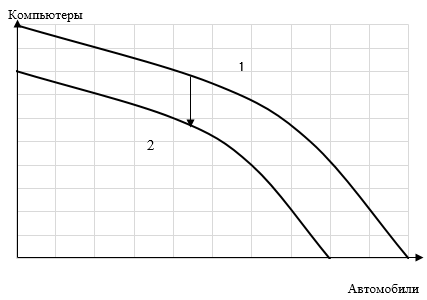 В случае оттока капитала из страны кривая производственных возможностей сдвигается из положения 1 в положение 2 влево вниз. Возможные объемы производства и компьютеров, и автомобилей снизятся.