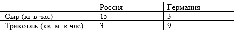 В таблице приведены затраты на производство сыра и трикотажа в России и Германии следующие: