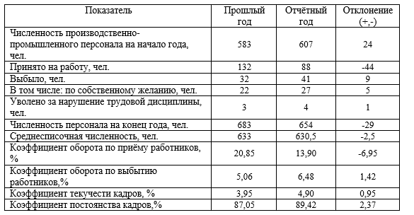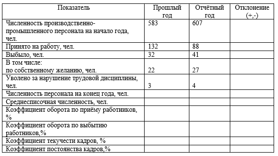 Заполните таблицу. Напишите выводы. Таблица - Данные о движении рабочей силы Показатель Прошлый год Отчётный год Отклонение (+,-)