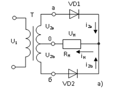 Свободные концы вторичных обмоток а и б присоединяются к анодам вентилей VD1 и VD2, катоды которых соединяются вместе. Нагрузка Rн включается между катодами вентилей, которые являются положительным полюсом выпрямителя, и нулевым выводом 0 трансформатора, который служит отрицательным полюсом. При...