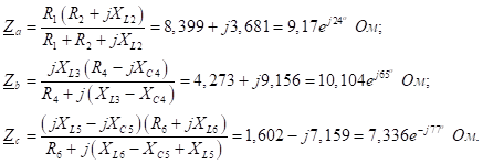 «1) Определить сопротивления и проводимости фаз; 2) Определить токи в фазах (их значения и фактическое положительное направление) при помощи комплексного метода; 3) Определить ток в нейтральном проводе;»