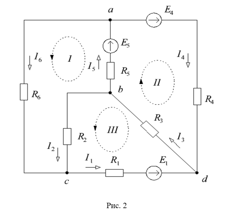 Для определения токов в ветвях цепи по законам Кирхгофа необходимо составить n-1=3 уравнение по первому закону, где n количество узлов в цепи; m=3 уравнения по второму закону, где m количество независимых контуров. Выберем условно-положительные направления токов в ветвях цепи (см. рис. 2).