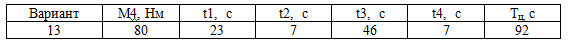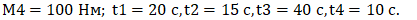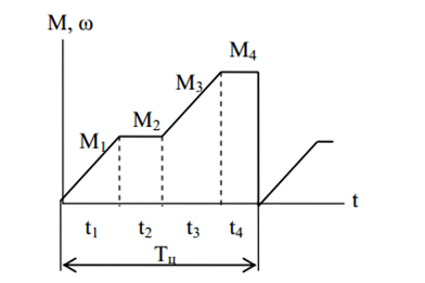 Цикл работы содержит 4 участка нагрузки без пауз, привод асинхронный короткозамкнутый, нерегулируемый, работает на естественной характеристике, нагрузочная диаграмма, рис. 9 – где М2=0,5М4