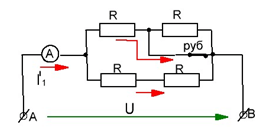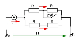Что покажет амперметр после замыкания рубильника, если до замыкания он показывал ток I1=9 A? Напряжение в обеих случаях постоянно.