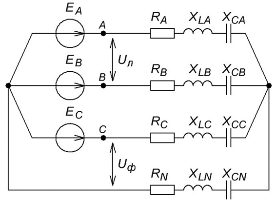 Рис. 1 Трехфазная асимметричная цепь трехфазного переменного синусоидального тока