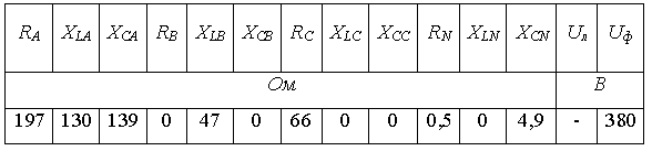 Для четырёхпроводной асимметричной цепи трехфазного переменного синусоидального тока, представленной на рисунке, построить векторные диаграммы напряжений и определить средний коэффициент мощности электроприемника при исправном и оборванном нулевом проводе, а также составить баланс мощностей при исправном нулевом проводе.