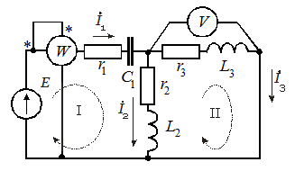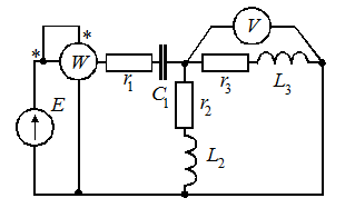 Е = 120 В, f = 50Гц, С1 = 637х10-6 мкФ, L2 = 15,9х10-3 мГн, L3 = 6,37х10-3 мГн, r1 = 5 Ом, r2 = 10 Ом, r3 = 8 Ом