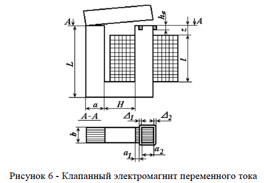 Для клапанного электромагнита переменного тока (рис.6) определить активное сопротивление экранирующего витка. Геометрические размеры электромагнита: Δ1 = 2 мм, Δ2 = 4 мм, 𝑎1 = 3 мм, 𝑎2 = 7 мм, 𝑎 = 12 мм, 𝑏 = 20 мм, ℎв = 3 мм, 𝐻 = 20 мм, 𝐿 = 52 мм. Виток