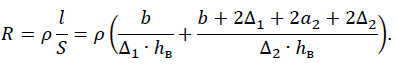 Для клапанного электромагнита переменного тока (рис.6) определить активное сопротивление экранирующего витка. Геометрические размеры электромагнита: Δ1 = 2 мм, Δ2 = 4 мм, 𝑎1 = 3 мм, 𝑎2 = 7 мм, 𝑎 = 12 мм, 𝑏 = 20 мм, ℎв = 3 мм, 𝐻 = 20 мм, 𝐿 = 52 мм. Виток выполнен из латуни 𝜌0=7∙10−8 Ом∙м, температура нагрева 𝜐=80°С (𝛼 = 0,0015 ℃−1).