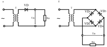 1) Схема (а) - однополупериодная однофазная схема выпрямителя, работающего на резистивную нагрузку сопротивлением RH.