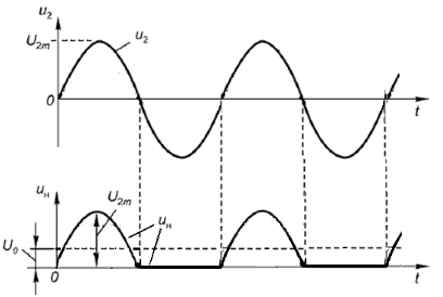 На Рис. 2 показаны временные диаграммы выпрямленного напряжения на нагрузке RH для однополупериодной схемы выпрямителя.