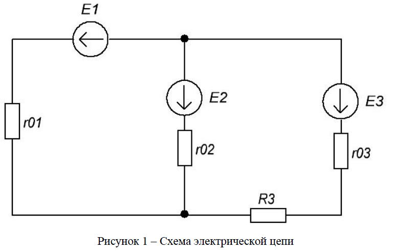 «Для схемы представленной на рисунке 1 найти токи в ветвях по законам Кирхгофа. Исходные данные: 𝐸1=10 В; 𝐸2=20 В; 𝐸3=30 В; 𝑟01=𝑟02=𝑟03=1 Ом; 𝑅3=29 Ом.»
