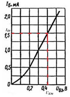 Зная напряжение покоя на базе UБЭ0= 0,4 В, находим ток покоя базы IБ0= 1,5 мА= 1,5∙10-3 А.