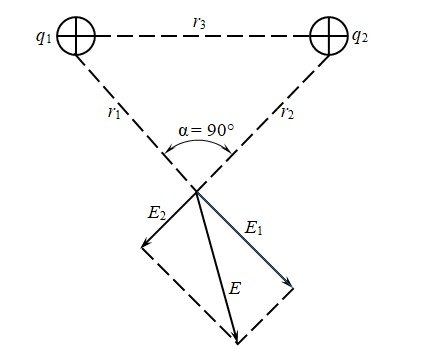 Напряженность поля в точке, удаленной на расстояния r1 = 0,04 м и r2 = 14 м от одного и другого зарядов, равна E = 54 кВ/м.