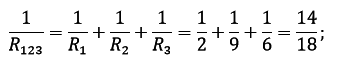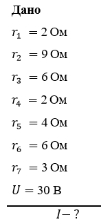 Группа из трех параллельно соединенных проводников в 2, 9 и 6 Ом соединена последовательно с другой группой из четырех параллельно соединенных проводников в 2, 4, 6 и 3 Ом. Напряжение сети равно 30 В.