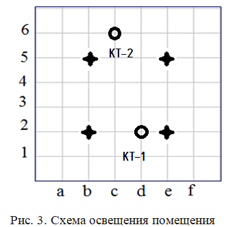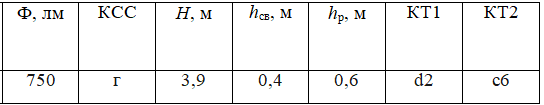 Каждый светильник имеет заданный световой поток Ф и определенный тип КСС. Для позиционирования светильников и контрольных точек применен принцип шахматной доски. Светильники расположены в точках b2, b5, e2, e5. Положение контрольных точек КТ1 и КТ2 и другие исходные данные указаны в таблице 8. Требуется рассчитать точечным методом освещенность