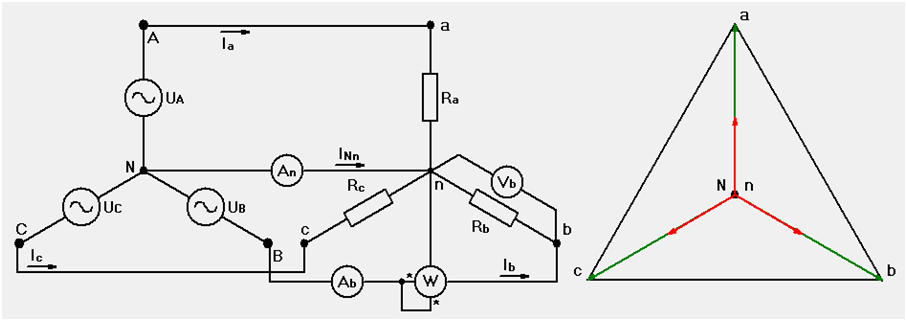 На рисунке слева представлена схема соединения «звезда – звезда с нулевым проводом». Справа представлена векторная диаграмма (рис. 1).