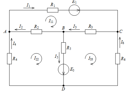 с неизвестными токами. Рассчитаем схему методом контурных токов, для этого составим систему из уравнений по методу контурных токов: