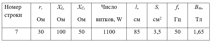 Параметры элементов схемы, максимальная величина магнитной индукции Вm, длина l средней магнитной линии и поперечное сечение S сердечника для различных вариантов (исходные данные) приведены в табл. 4. Значения индуктивного XL, и емкостного ХC сопротивлений соответствуют частоте f, указанной в этой же таблице.