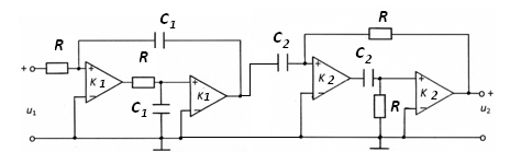 определить значение коэффициента усиления усилителя первого звена фильтра, при котором цепь будет находиться строго на границе устойчивости. Указать, чему при этом равна частота свободных колебаний в каскаде.
