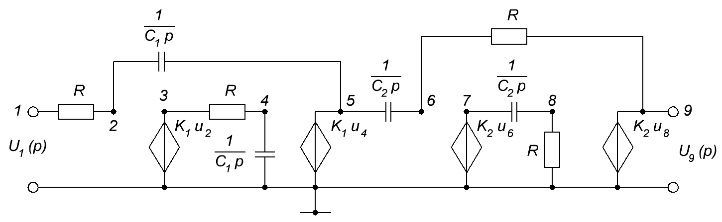 найти операторную передаточную функцию фильтра, составив и решив систему узловых уравнений;