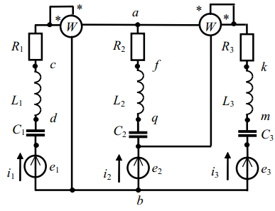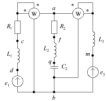 Определить комплексы действующих значений токов во всех ветвях, воспользовавшись одним из методов расчета линейных электрических цепей. Определить показания ваттметров.
