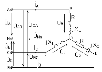 Определить токи, мощности и построить векторную диаграмму токов и напряжений. U_n = 380 В R = 4 Ом X_L = 3 Ом X_C = 3 Ом.