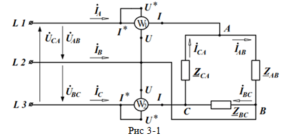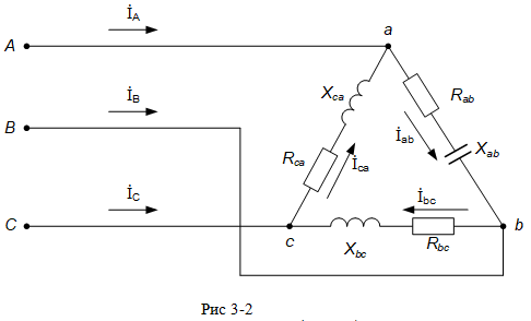 Потребитель электроэнергии, фазы которого имеют комплексные сопротивления (Рис 3-1), соединены в трёхфазную электрическую цепь треугольником, питается симметричной системой линейных напряжений.