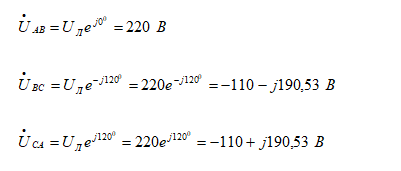 cоединены в трехфазную электрическую цепь «треугольником»,питается симметричной системой линейных напряжений: