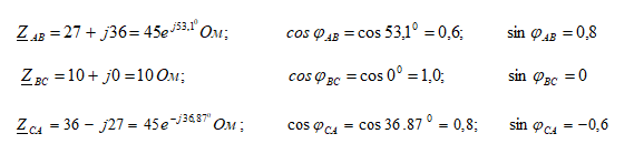 1. Запишем комплексные сопротивления фаз потребителя в показательной форме.