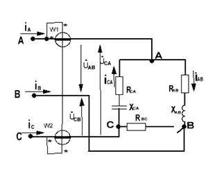 Потребитель электроэнергии, фазы которого имеют комплексные сопротивления: Z_(AB), Z_(BC), Z_(CA) cоединены в трехфазную электрическую цепь «треугольником»,, питается симметричной системой линейных напряжений: