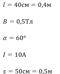 Прямолинейный проводник длиной 40 см находится в магнитном поле с индукцией 0,5 Тл под углом 60° к линиям индукции. Определить работу, которую совершает магнитное поле, если по проводнику течёт ток 10 А и он переместился на 50 см.