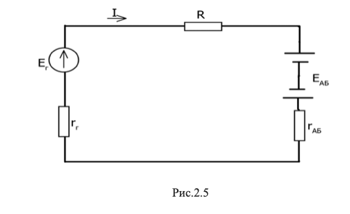 Определить ток I в электрической цепи постоянного тока (рис.2. 5), а также диапазон изменения сопротивления резистора R для зарядки аккумуляторной батареи до ЭДС ЕАБ=16 В в конце зарядки при неизменном токе нагрузки цепей. Сопротивление резистора R= 4 Ом, ЭДС генератора Ег=36В, внутреннее сопротивление генератора rг=0.30 Oм,