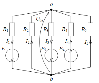 Задаемся положительными направлениями токов, обозначаем узлы. Принимаем потенциал узла aравным нулю: a=0. Так как в схеме два узла, а потенциал одного из них принят равным нулю, то записывая узловое уравнение по методу узловых потенциалов, находим узловое напряжение: