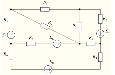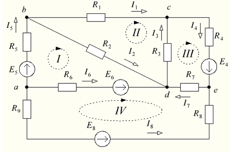 Запишем необходимое количество уравнений по первому и второму законам Кирхгофа. Схема имеет пять узлов, четыре независимых контура, восемь ветвей с неизвестными токами. Для определения не...
