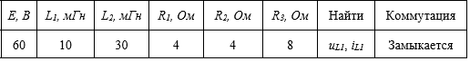 Рассчитать мгновенные значения величин, указанных в таблице, после выполнения коммутации. Схема электрической цепи изображена на рисунке, параметры элементов цепи и вид коммутации указаны в таблице. Построить графики рассчитанных величин.