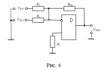 Схема двухвходового инвертирующего сумматора на операционном усилителе изображена на рис. 4.