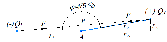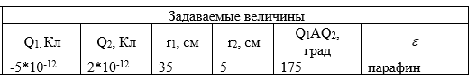 «Точка А удалена от двух точечных зарядов Q1 и Q2, помещенных в диэлектрик на расстояние r1 и r2. Заряды и точка А образуют угол Q1АQ2. Данные для решения задачи указаны в таблице. 1. Определить силу взаимодействия двух точечных зарядов и расстояние»