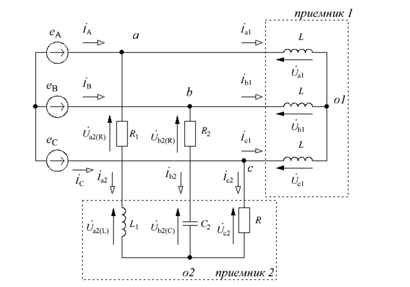 Трехфазный генератор создает симметричную систему ЭДС с прямой последовательностью чередования фаз: 1. Изобразим схему электрической цепи и обозначим фазные и линейные токи и напряжения на элементах цепи (см. рис. 2).