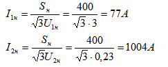 Определим номинальные токи первичной и вторичной обмоток: