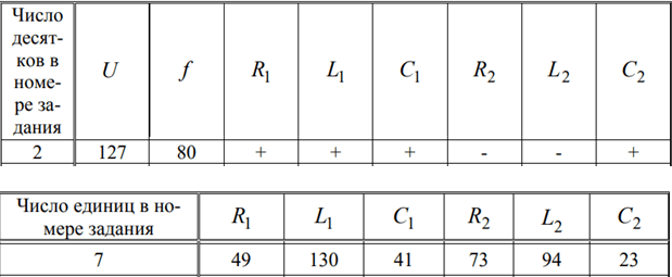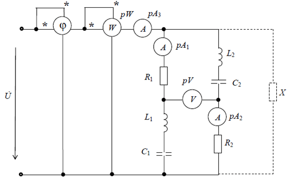 В сеть включены по приведенной схеме две ветви, требуется: 1) Определить показания приборов 2) Вычислить полную комплексную мощность цепи 3) Рассчитать параметры элемента X (индуктивности или емкости),