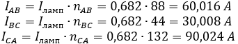 Дано: UЛ=220 В, IЛАМП=0,682 A, nAB=88 шт, nBC=44 шт, nCA=132 шт,