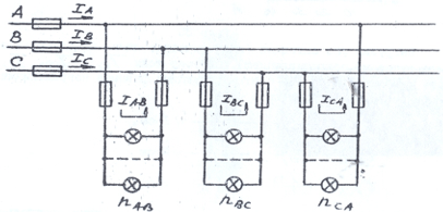 В трехпроводную сеть трехфазного тока включены по схеме «треугольник» три группы электрических ламп накаливания одинаковой мощности. В каждой фазе (группе) лампы соединены параллельно.