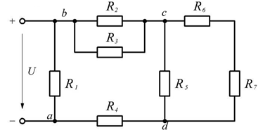 Исходные данные: U = 75В, R1= 5 Ом, R2= 20 Ом, R3= 10 Ом, R4= 20 Ом, R5 = 20 Ом, R6= 10 Ом, R7= 20 Ом
