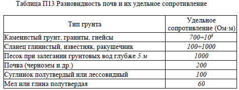 По таблице П13 находим удельное сопротивление грунта типа суглинок: = 100 Омм.